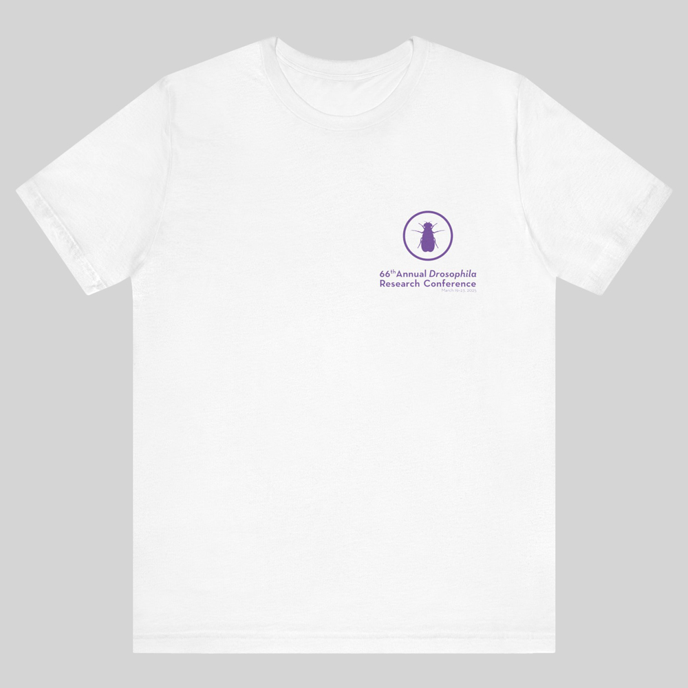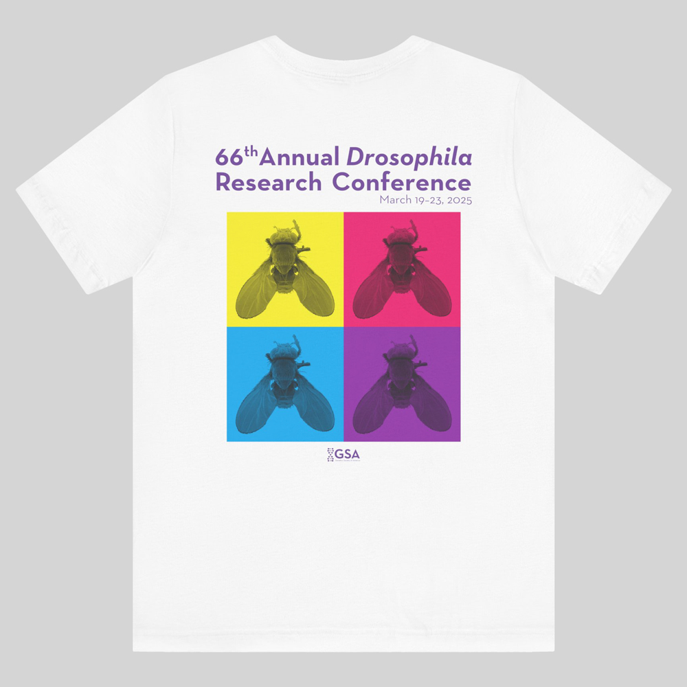 Commemorate your time at the 66th Annual Drosophila Research Conference and take home a memory you can wear for years to come, plus show off to your colleagues and friends! This T-shirt shows an image of a fruit fly in a Pop Art design aesthetic. Don’t forget to order by January 21, 2025; the T-shirts are $30, which you’ll pay when you place the order during the online registration process. The T-shirts can be picked up at the registration desk beginning on Thursday, March 20.